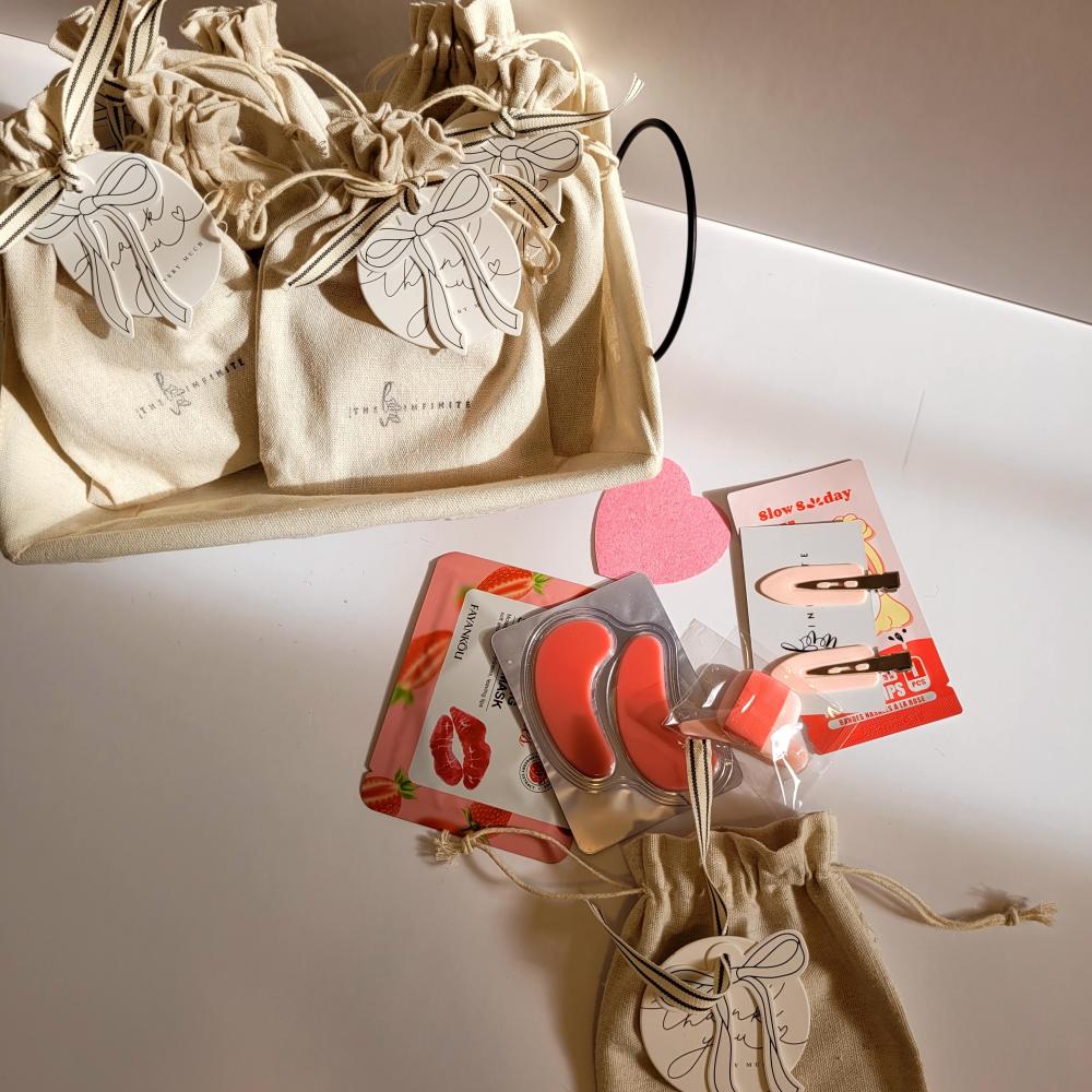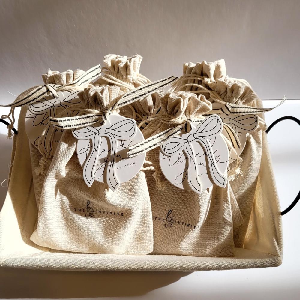 تُقدَّم هذه التوزيعات الأنيقة داخل حقائب مصنوعة من قماش اللينن الطبيعي، برباط محكم وتصميم راقٍ، مما يمنحها طابعًا فاخراً وعصرياً. كما تزينها بطاقات شكر مزخرفة بشريط أنيق، مما يجعلها خيارًا مثالياً للهدايا .